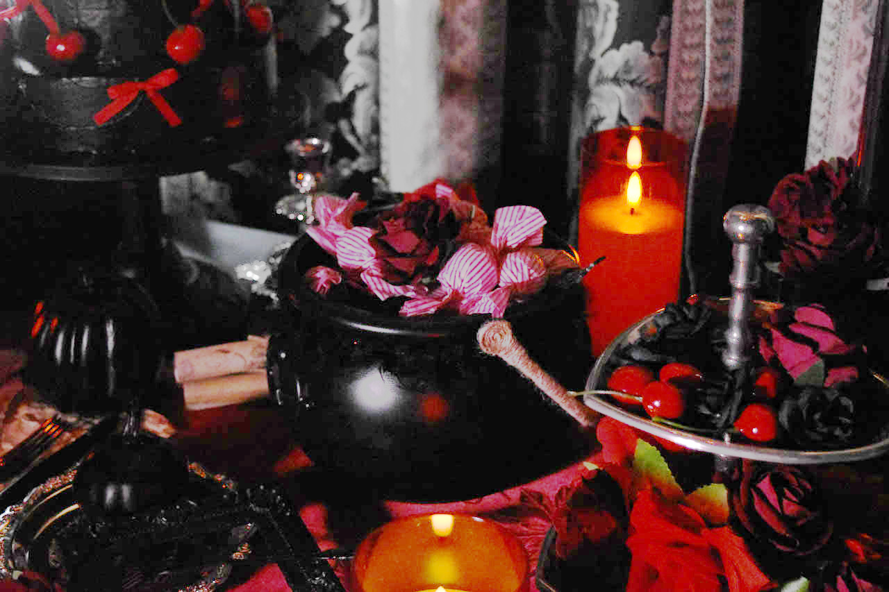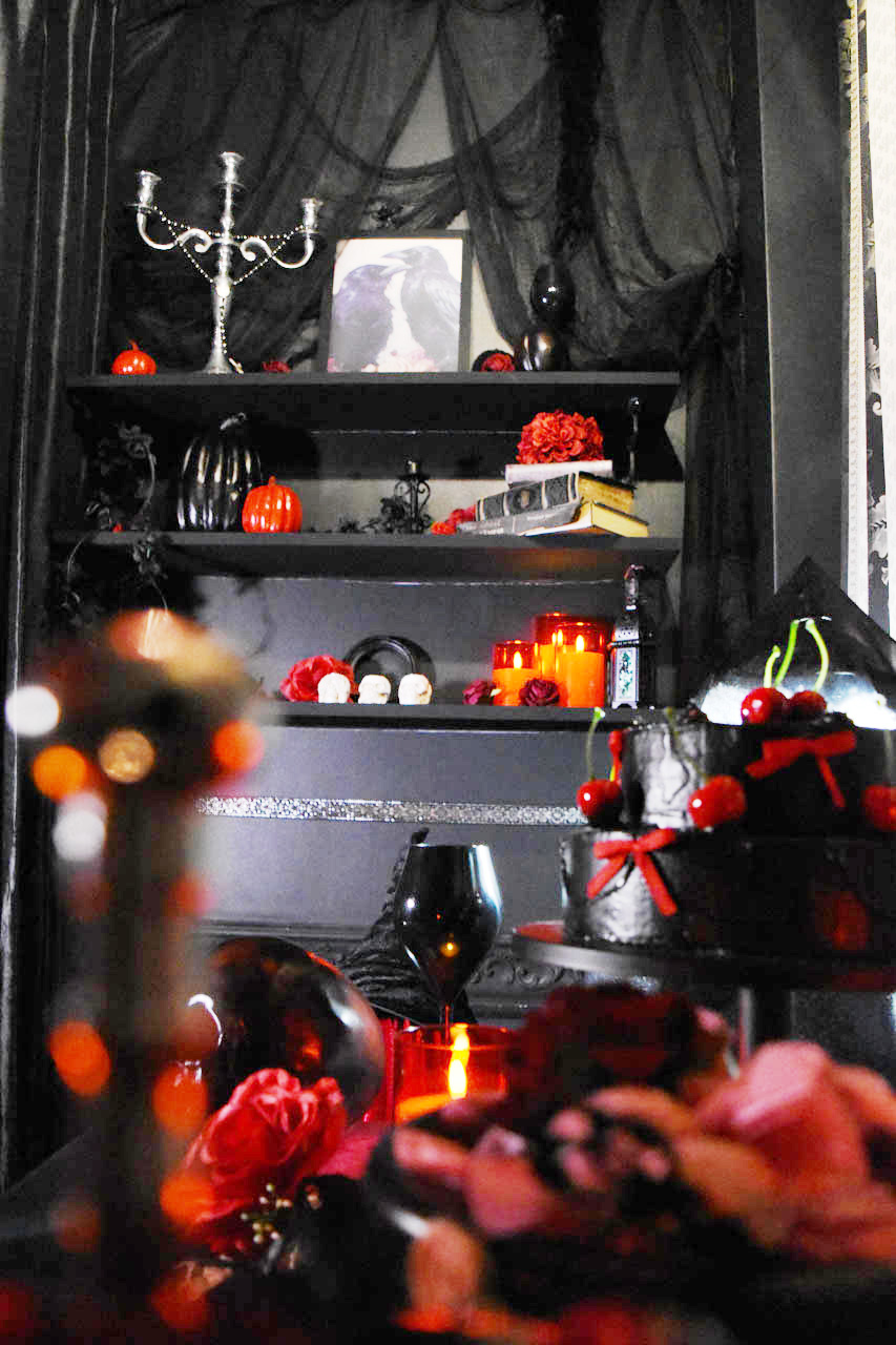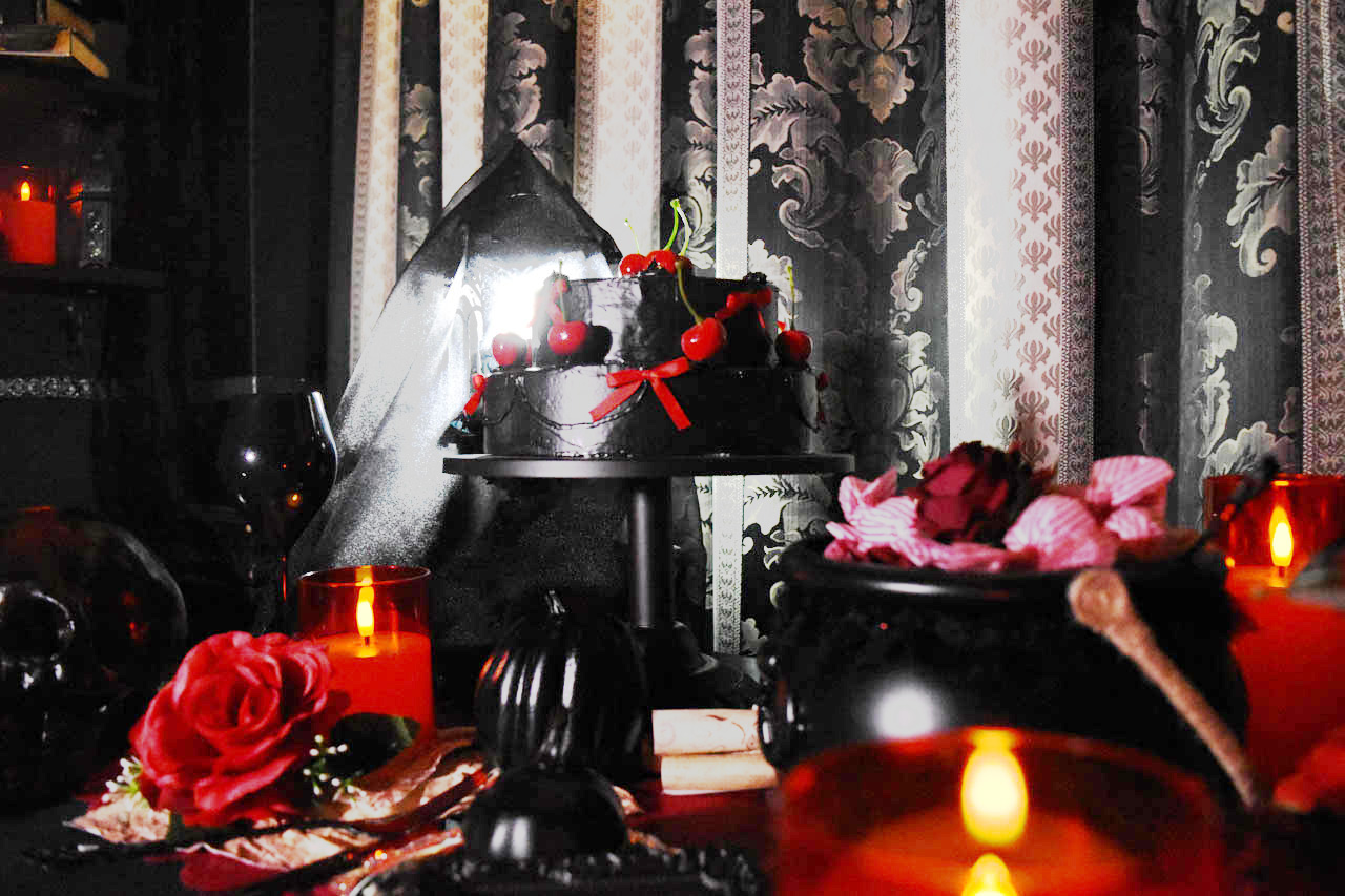 ・黒いレースカーテンと赤のシャンデリア